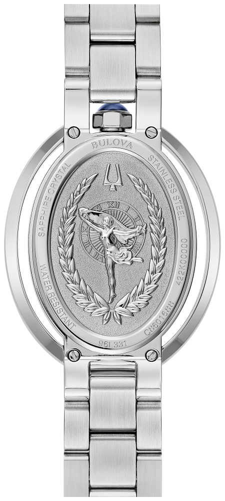 Capturing the uncompromising elegance of the iconic Rubaiyat collection, this Bulova women’s timepiece makes a bold statement with its unique case and distinctive dial. Fully polished, the oval silver-tone stainless steel case is accented by two sweeping bands that extend from end to end, adding a dynamic presence on the wrist. The crown, positioned at 12 o’clock, is set with a blue synthetic spinel cabochon, while the double domed sapphire crystal ensures optimum legibility. The elegant salmon-tone dial is appointed with a balance of polished silver-tone applied Roman numeral and baton hour markers and matching hands. It features a striking guilloche-like texture in a concentric rose motif for a mesmerizing appearance. Completing the ensemble is a matching 3-link silver-tone stainless steel bracelet with an effortless push-button deployant closure. Stand out in style with this Bulova ladies’ Rubaiyat timepiece.